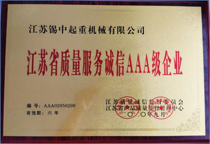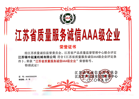 公司獲得《江蘇省質量服務誠信AAA級企業》